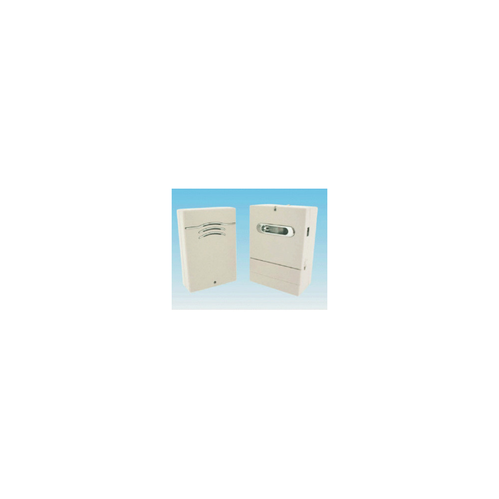 Compuesto de dos partes, un sensor emisor de infrarrojos y un receptor avisador. El sensor emisor detecta el calor del cuerpo y sus movimientos a una distancia de 5 metros y un ángulo de 95º. Alimentado por tres pilas alcalinas (no inluidas). Dispone de una toma para poder alimentarlo de la red a través de un transformador de entrada 230VAC y salida 4.5VDC (no incluido). También puede usarse como timbre convencional sin hilos pulsando la regleta situada debajo del sensor. El receptor avisador se enchufa a la red directamente. Dispone de 3 opciones acústicas de aviso. Alcance del emisor: 100 metros. Aprox.