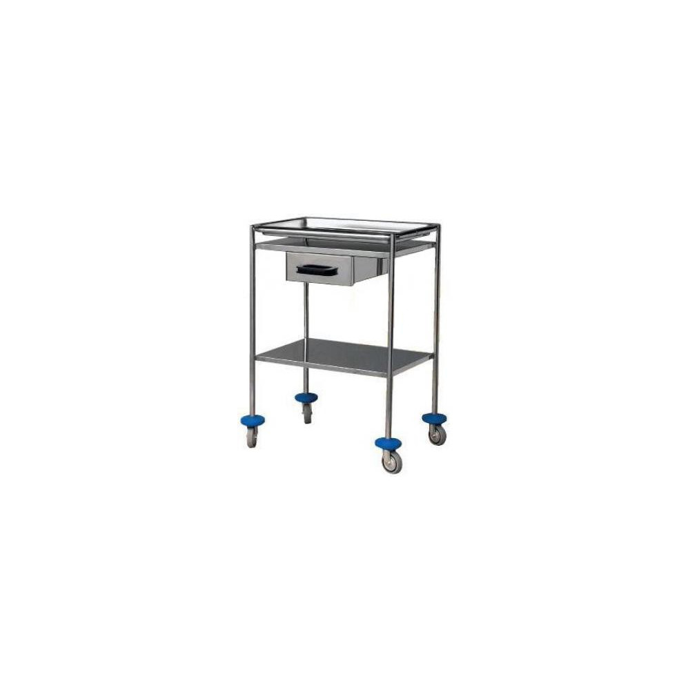 Carro de curas en acero inoxidable, compuesto de 1 bandeja extraíble, 1 cajón en acero inox. Y entrepaño inferior liso. Medidas: 600 x 400 x 840. 4 ruedas de Ø 75 mm con paragolpes.
