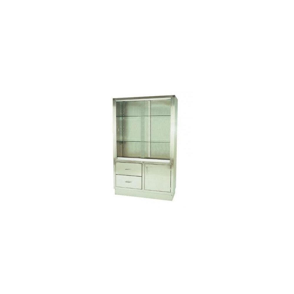 Vitrina armario en acero, compuesta en la parte superior por 2 baldas de cristal regulables en altura y puertas correderas de cristal con cerradura. La parte inferior compuesta dos cajones compactos con autocierre, armario con puerta abatible y balda intermedia. Peso: 85 kg. Medidas: 970 x 400 x 1600 cm. Disponible en acero esmaltado (1MC0915-AE) y en acero inoxidable (1MC0915-AI).