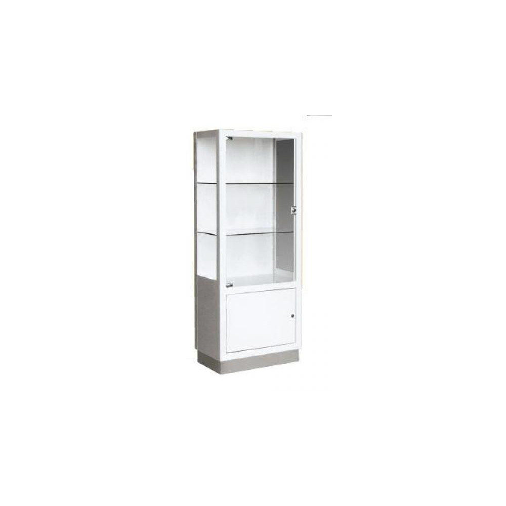 Vitrina de acero con 1 puerta de cristal abatible y cerradura, compuesta de 2 baldas de cristal regulables en altura y zócalo en acero inoxidable. Laterales de cristal. La parte inferior está compuesta por 1 puerta abatible metálica con cerradura y en su interior una balda fija. Peso: 40 Kg. Medidas: 550 x 350 x 1400 cm. Disponible en acero esmaltado (1MC0922-AE) y en acero inoxidable (1MC0922-AI).