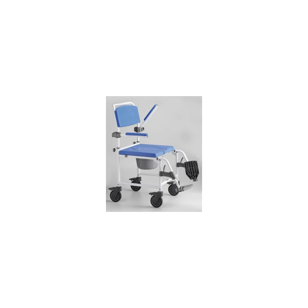 Silla de aluminio y materiales de PU y PVC los cuales eliminan el riesgo de corrosión. Los reposapiés desmontables y reposabrazos abatibles facilitan el acceso del usuario a la silla. Su asiento incorpora un cubo inodoro de color gris que permite utilizar esta silla como inodoro, o bien como pedestal para WC. Incorpora 4 ruedas grises de 125mm las cuales poseen frenos para una mayor seguridad. Altura total:101 cm. Ancho total:56 cm. Medidas del asiento:45x42,5x40cm. Medidas del respaldo:47,5x22,5x30 cm. Altura de los reposabrazos :73 cm. Peso de la silla: 13,2Kgs. Peso máximo del usario: 100 Kgs.