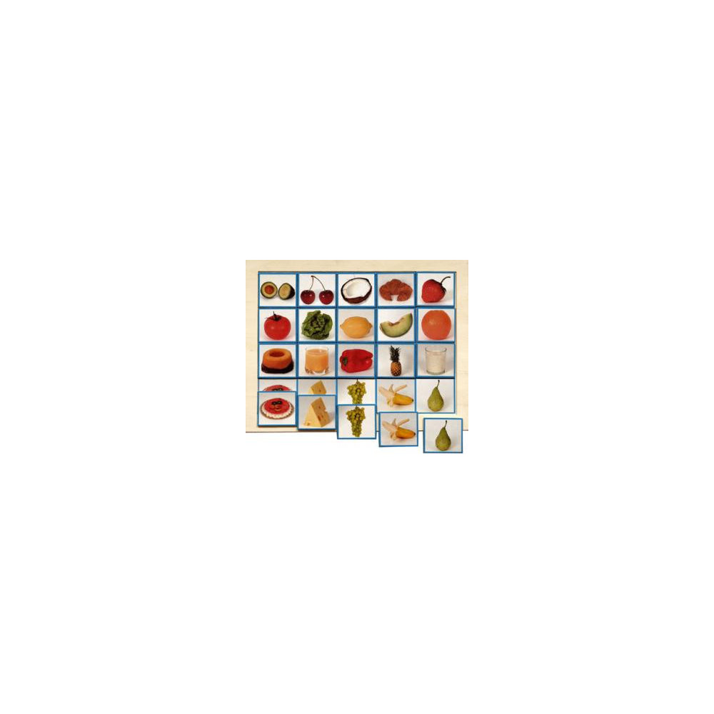 Loto fotografías de alimentos. 20 piezas de 5,5x6,5cm. Medidas bandeja 29x38cm.