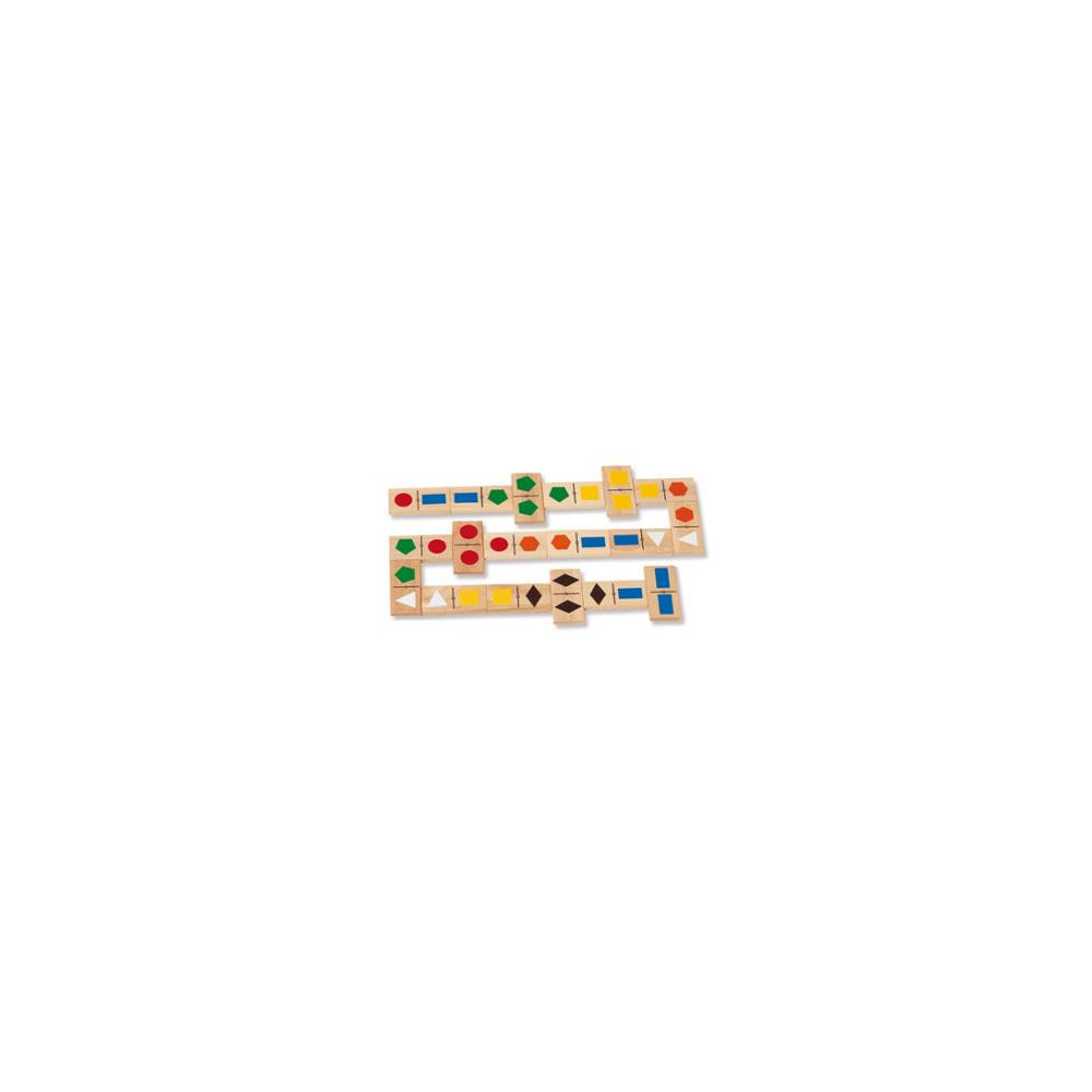 Dominó de formas geométricas de diferentes colores. Fábricado en madera, consta de 28 piezas. Medias: 7x3,5cm cada pieza.