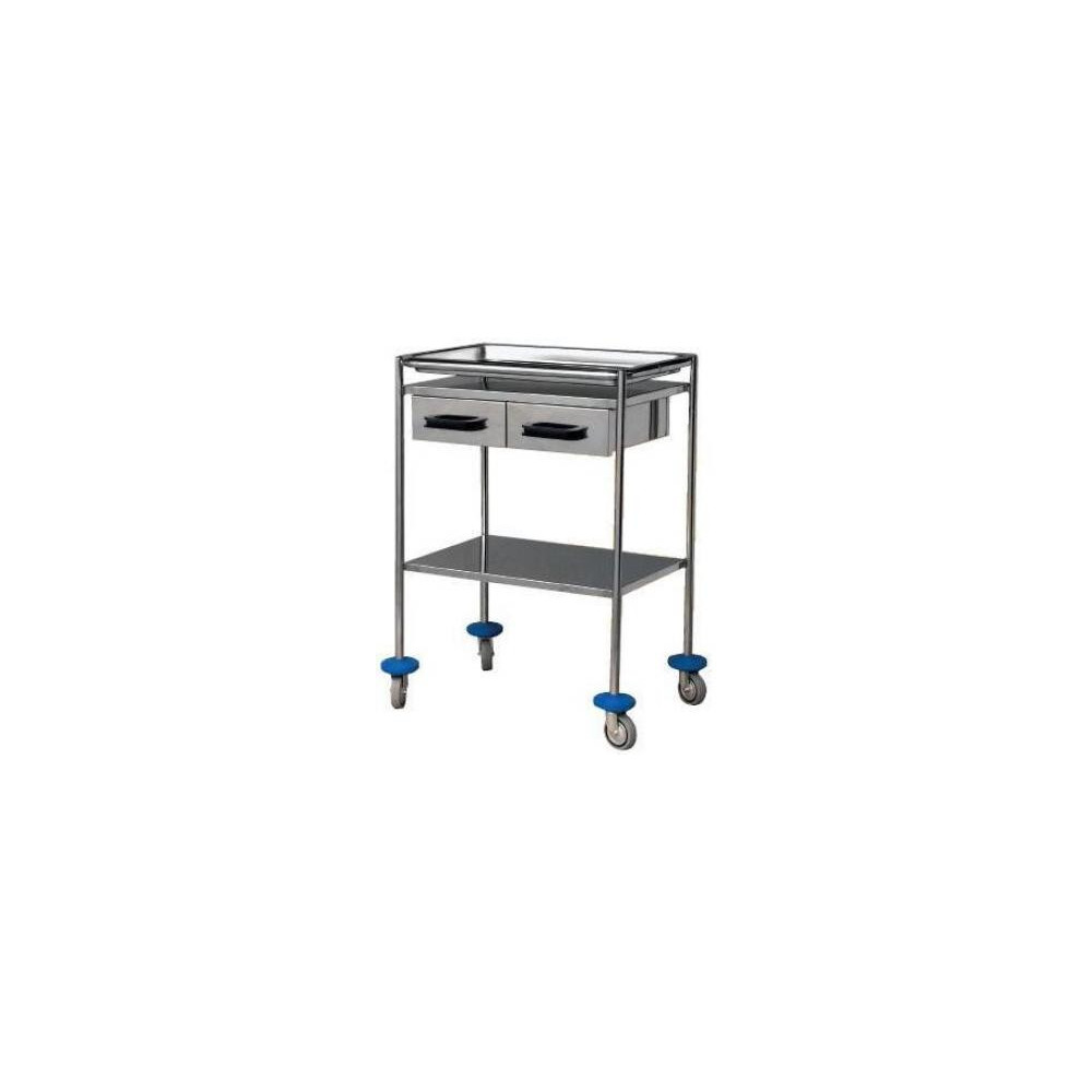 Carro de curas en acero inoxidable, compuesto de 1 bandeja extraíble, 2 cajones en acero inox. Y entrepaño liso. Medidas: 600 x 400 x 840. 4 ruedas de Ø 75 mm con paragolpes. Peso: 15 Kg.