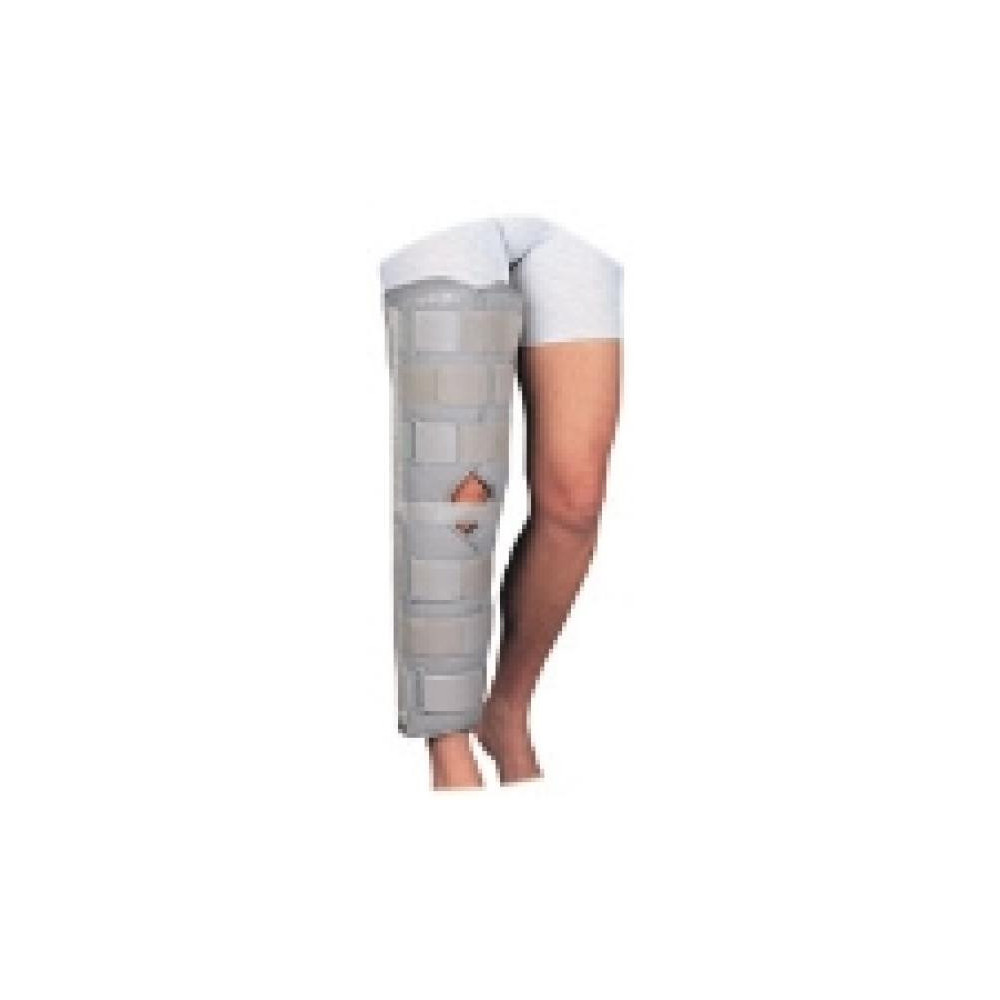 Aporta soporte e inmovilización a la rodilla en el post-operatorio. Paneles laterales ajustables con varillas cosidas y cincha rotuliana que permiten un ajuste correcto y una fácil colocación. Tres varillas de aluminio en la parte posterior para alcanzar una inmovilización adecuada. Cierre con velcro. Disponible en 3 longitudes: 40cm, 50cm y 60 cm.